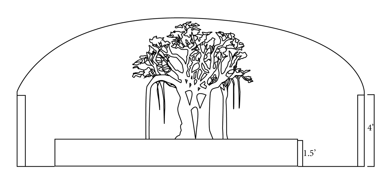 A gently curving wall, fashioned of Natural Stone / fine marble, will set off the fountain and provide a backdrop for reflection. Bronze or stainless-steel plaques with inscriptions and symbols will adorn the wall.